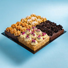 Wheatless gluten free coconut sponge cake topped with mascarpone cheese and aromatic coffee buttercream frosted with cocoa almond praline toppings.