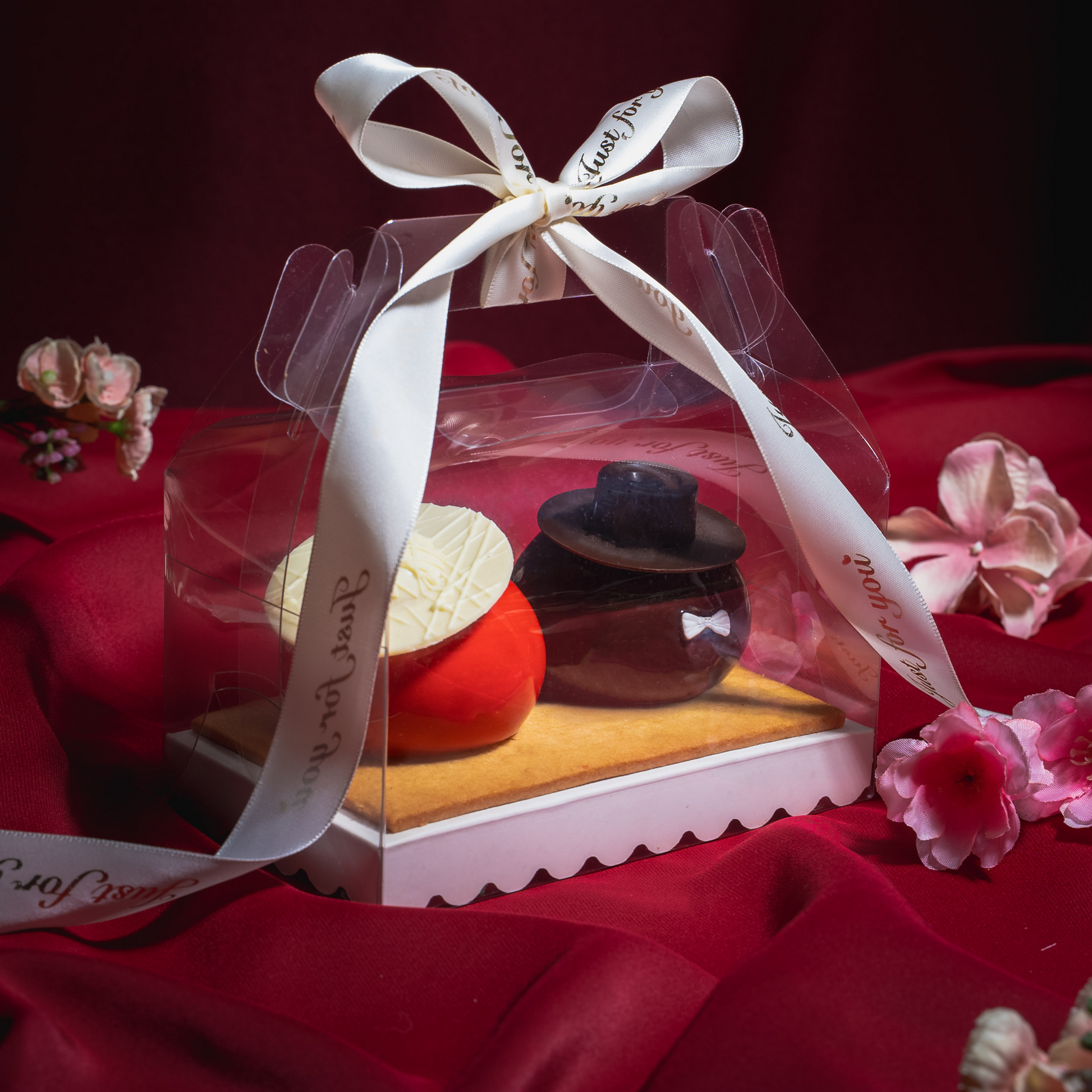 Inside this duo: two handcrafted gateaux, one rich and intense, the other bright and refreshing.