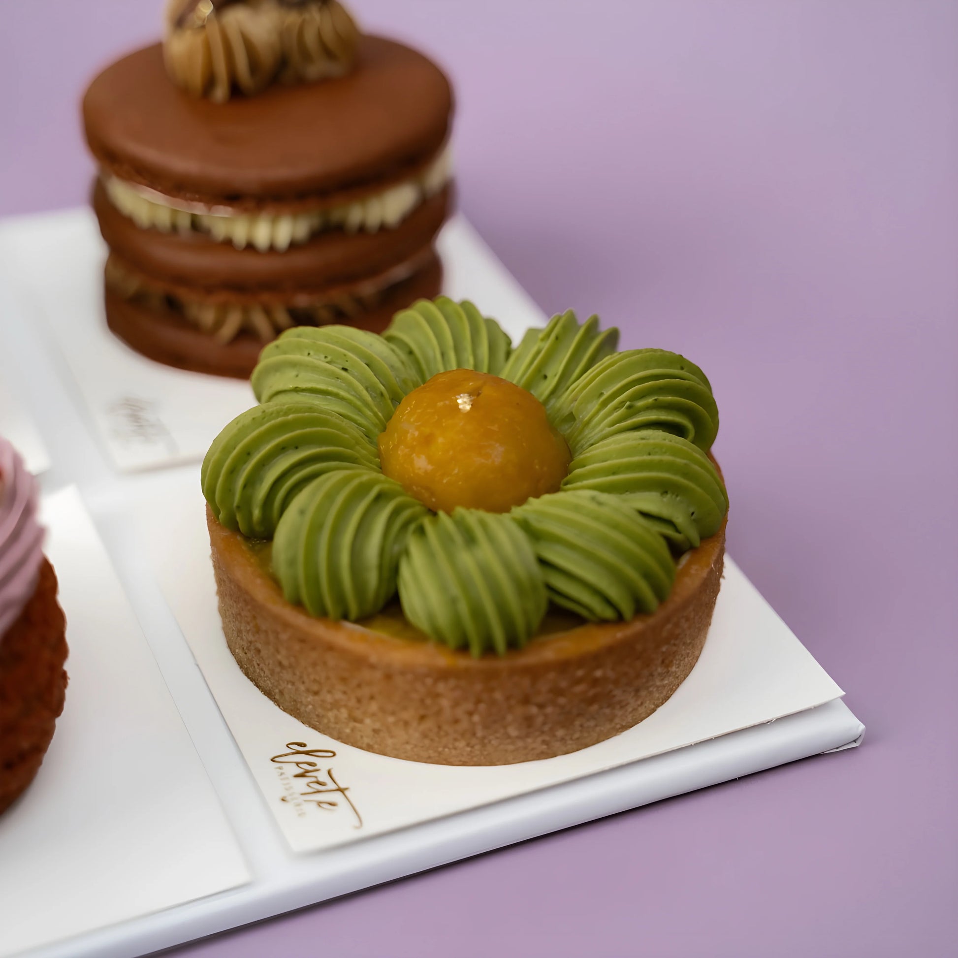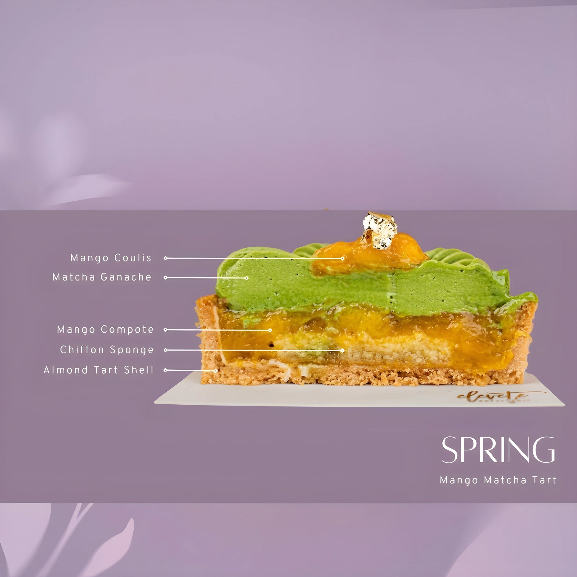 Continue your journey with Spring, a tart with mellow grassy notes and touch of bitterness from the matcha ganache, paired with a refreshing mango compote brings the perfect balance of fruity and earthy with just the right amount of sweetness.