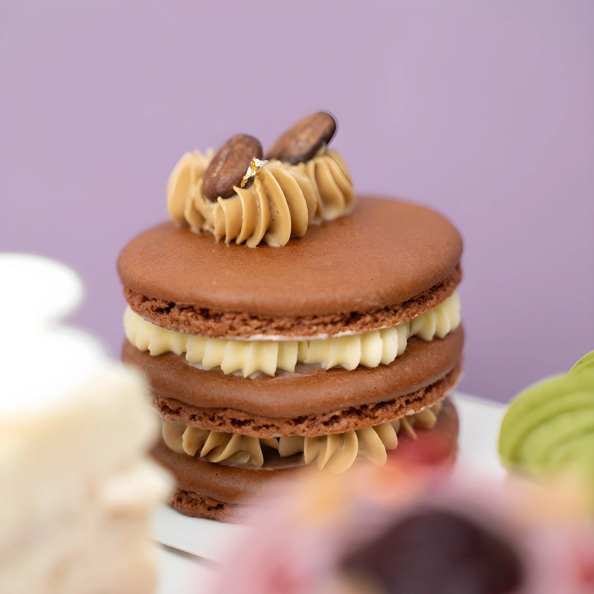 Complete your sensory journey with our Tiramisu Macaron. Infused with rich coffee and cocoa notes, along with a hint of creamy and luscious mascarpone cheese mixture. It's a sophisticated dessert that offers a delightful balance between sweetness and the subtle bitterness of coffee.