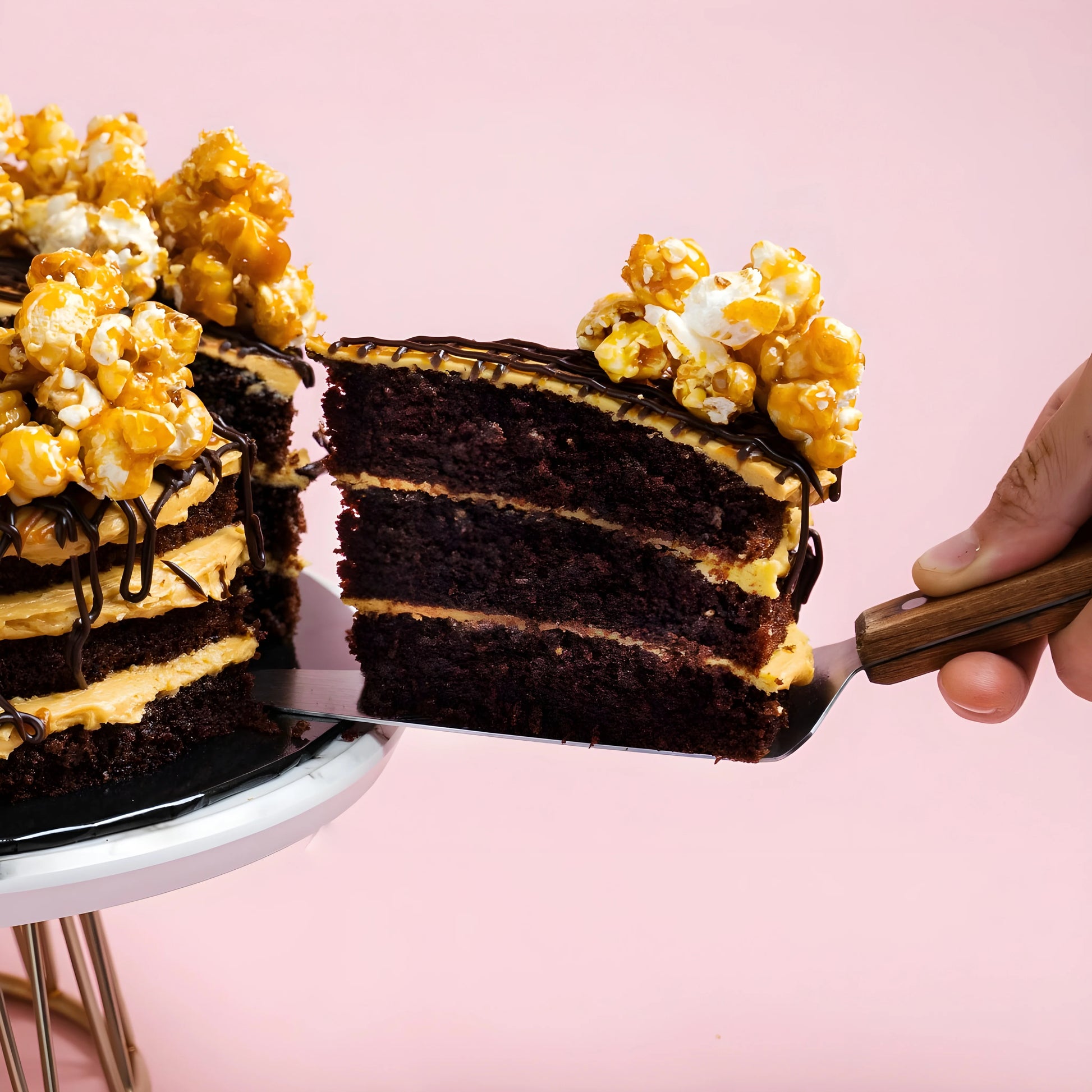 Fully covered with our homemade popcorn, our Salted Caramel Chocolate Popcorn Cake is sandwiched with our homemade salted caramel sauce. Topped with a generous amount of homemade popcorns will POP with every bite you take. If the 7 inch Salted Caramel Chocolate Popcorn Cake is not enough for you, get this 9 inch one which has more popcorns on it!