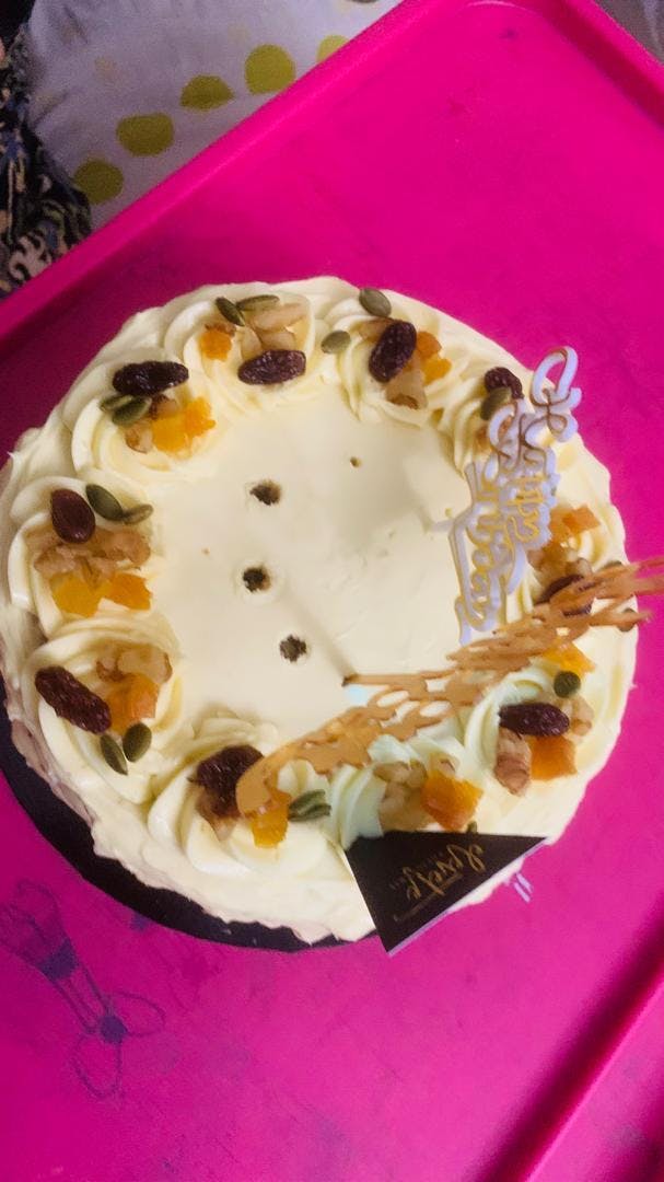 Made with freshly grated carrots, spiced with aromatics of cinnamon; nutmeg, our moist Carrot Walnut Cake base is made with sourdough! The tangy sourdough starter adds depth of texture and flavour to the moist carrot cake base, while the toasted walnuts provide a crunchy contrast. Finally, topped with its crowning glory of a velvety, rich cream cheese frosting, covered with pumpkin seeds & dried apricots that takes it over the top!