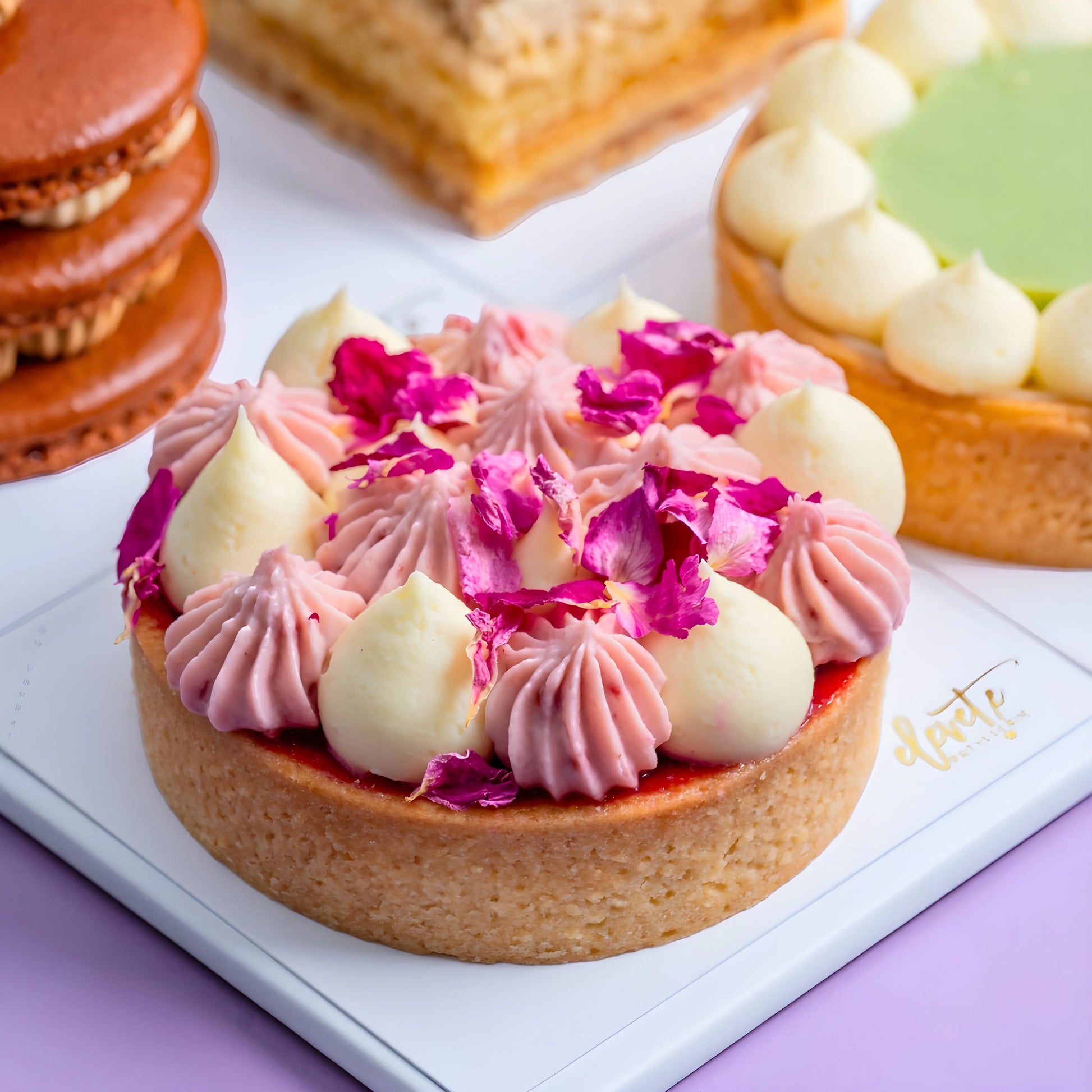 🌹 Rose Lychee Raspberry Tart – A floral-fruity dream of delicate rose cream, juicy raspberry, and sweet lychee, layered in a tart that feels as graceful and elegant as a bouquet of fresh blooms.